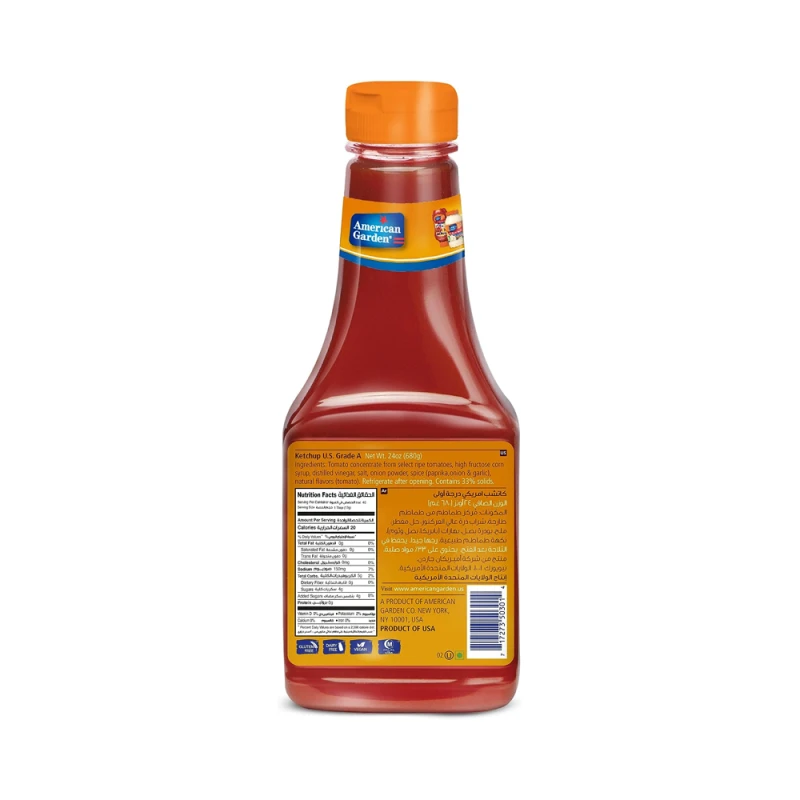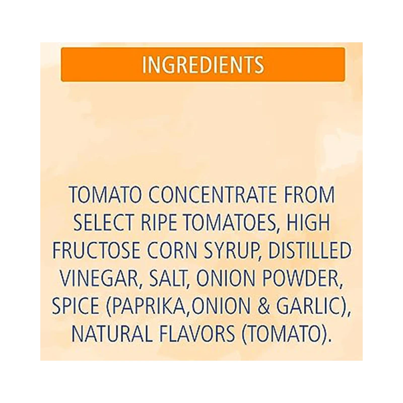 مُركز طماطم من طماطم ناضجة، شراب ذرة عالى الفركتوز، خل مقطر، ملح بودرة بصل، بهارات (بابريكا، ثوم), نكهات طماطم طبيعية