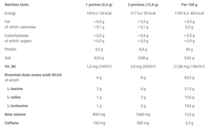 - مكمل غذائي على شكل مسحوق يحتوي على أحماض أمينية متفرعة السلسلة ومجمع BCAA (L-leucine وL-valine وL-isoleucine) بنسبة 2:1:1 مع بيتا ألانين والكافيين وفيتامين B6. مع المحليات. يساهم فيتامين ب6 في عملية التمثيل الغذائي الطبيعي لإنتاج الطاقة وفي تقليل التعب والإرهاق.