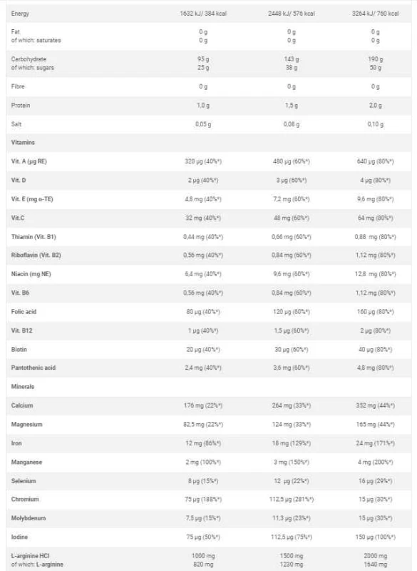 تم أيضًا إثراء Carbonox بمادة L-arginine، المستخدمة كركيزة لتخليق أكسيد النيتريك (NO). مركب مكون من 12 فيتامين من جميع المجموعات الأكثر أهمية يزيد من هضم الكربوهيدرات ويكثف التحويلات الأيضية. علاوة على ذلك، فإن الإمكانات الكبيرة المضادة للأكسدة الموجودة في بعض الفيتامينات تمنع تلف البروتينات الهيكلية من خلايا العضلات في الوقت المحيط بالتمرين، وبالتالي تسريع عملية تجديدها على المستوى الجزيئي.