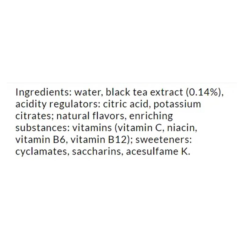 ماء، مستخلص الشاي الأسود (0.14%)، منظمات الحموضة: حامض الستريك، سترات البوتاسيوم؛ نكهات طبيعية، مواد غنية: فيتامينات (فيتامين ج، النياسين، فيتامين ب6، فيتامين ب12)؛ المحليات: السيكلامات، السكرين، اسيسولفام ك.