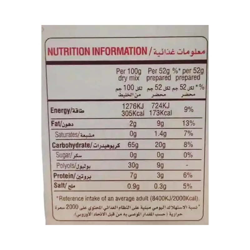 دقيق القمح مالتيتول نشاء القمح مستلبات نباتية زيت صويا , حليب منزوع القشطة , ملح نكهة الفانيلا المماثلة للطبيعة , فانيلين مواد تحلية اصطناعية, سكر الوز , الكمية المسموح بتناولها يوميا من السكر الوز5 ملجم/ كلجم من وزن الجسم .
