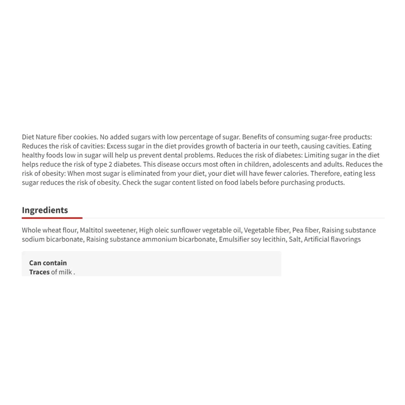 دقيق القمح الكامل 65%، محلي (مالتيتول)، زيت نباتي (دوار الشمس عالي الأوليك) 16%، ألياف البازلاء 3%، إينولين، أوليغو فركتوز، مخمر (بيكربونات الصوديوم، بيكربونات الأمونيوم)، مستحلب (ليسيثين الصويا)، ملح، نكهات اصطناعية. تنبيهات إضافية: قد يحتوي على آثار من الخردل والحليب، الاستهلاك المفرط يمكن أن يكون له آثار ملينة، تحتوي العبوة على حوالي 20 بسكويتة (وزن الواحدة 8.5 جرام تقريباً)، يحفظ في مكان بارد وجاف بعيداً عن أشعة الشمس ويغلق جيداً بعد كل استخدام.