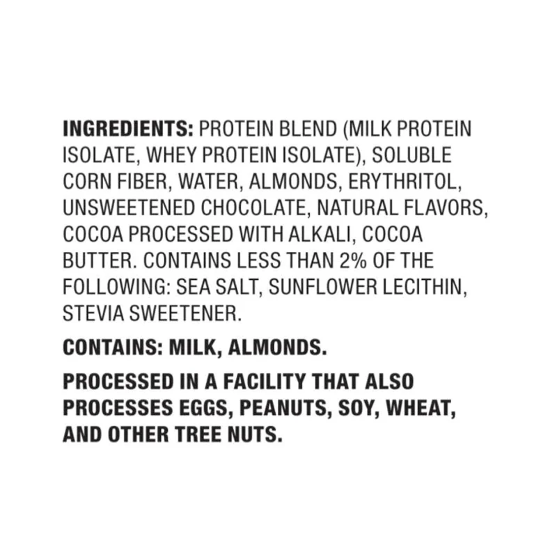 مزيج البروتين (بروتين الحليب المعزول، بروتين مصل اللبن المعزول)، ألياف الذرة القابلة للذوبان (ألياف البريبايوتك)، اللوز، إريثريتول، ماء، شوكولاتة غير محلاة، كاكاو (معالج بالقلويات)، نكهات طبيعية، زبدة الكاكاو، زيت النخيل، ملح البحر، كربونات الكالسيوم. ، ستيفيول جليكوسيدات (ستيفيا).