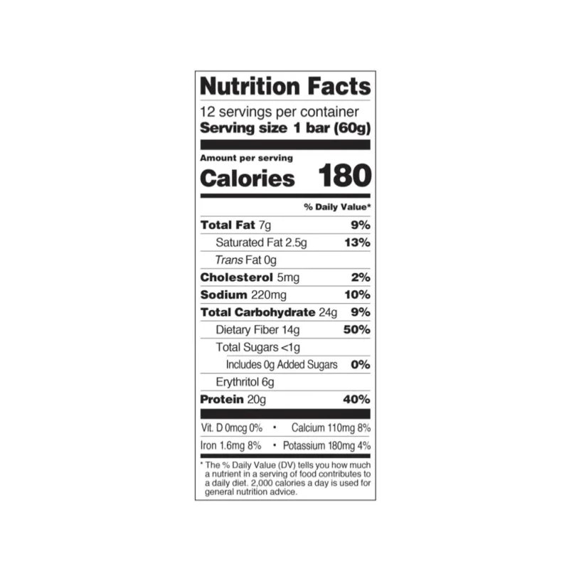 20 جرام بروتين أقل من 1 جرام سكر 13 جرام ألياف خالي من الغلوتين 23 جرام كربوهيدرات - 13 جرام ألياف - 6 جرام إريثريتول = 4 جرام صافي الكربوهيدرات