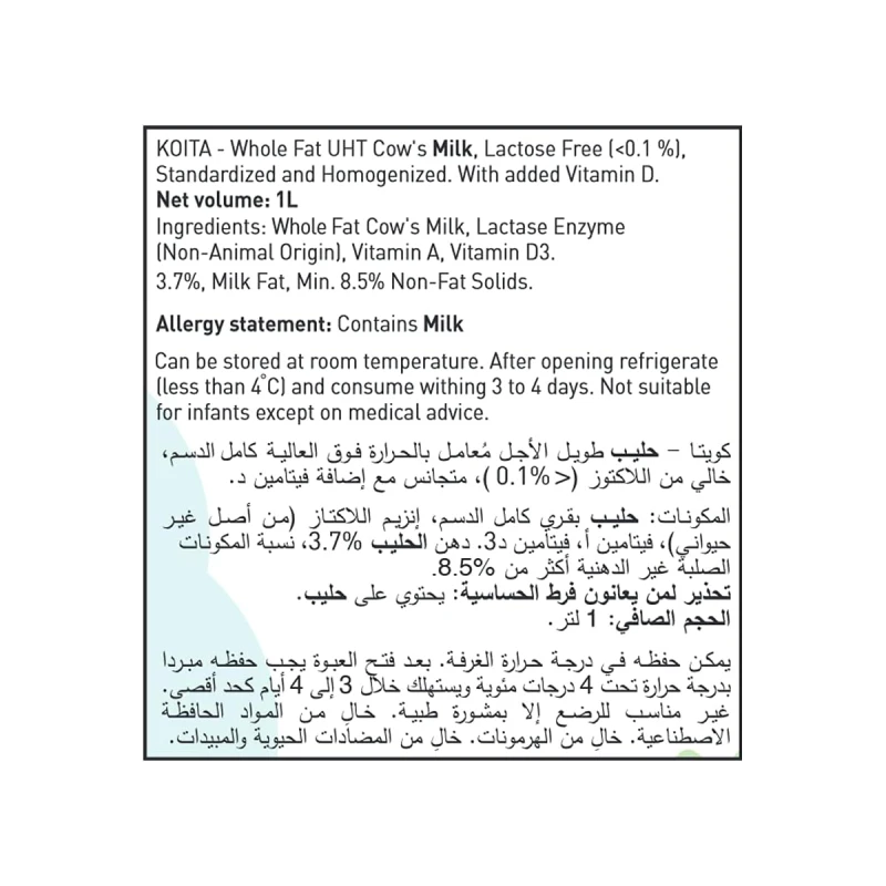 كويتا حليب خالي لاكتوز كامل الدسم 1 لتر
