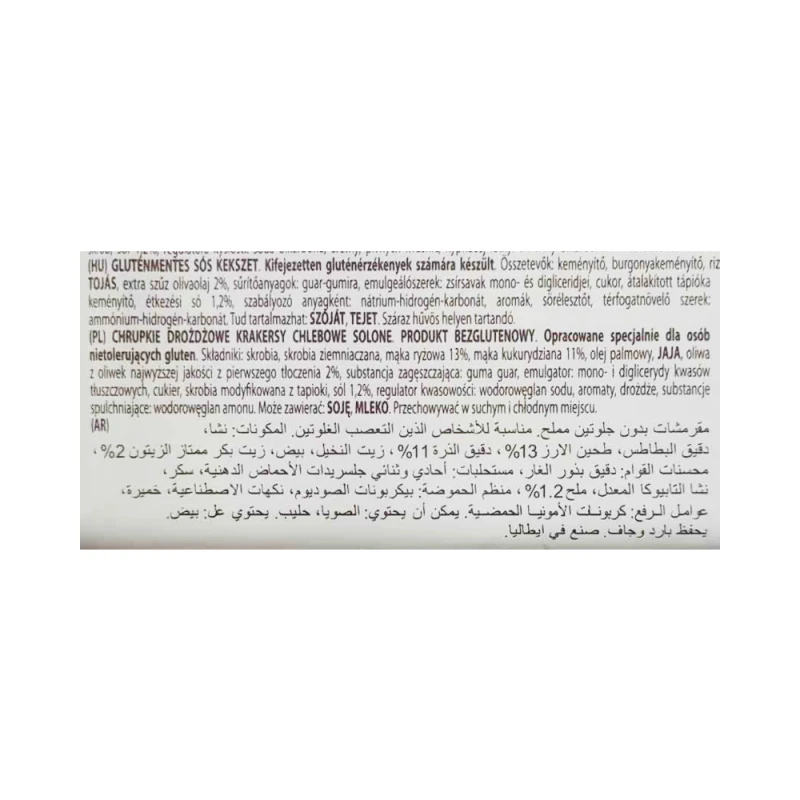 * دقيق قمح ، * زيت زيتون بكر ممتاز 10٪ ، منظم حموضة: بيكربونات الصوديوم ، ملح 0،9٪ ، * عجين مخمر 0،6٪ (قمح وبرلي) ، * دقيق برلي مملح ، * خميرة بيرة ، مضاد للأكسدة: * مستخلص إكليل الجبل .
