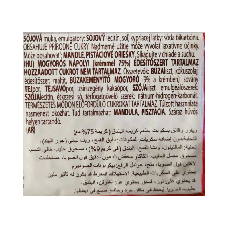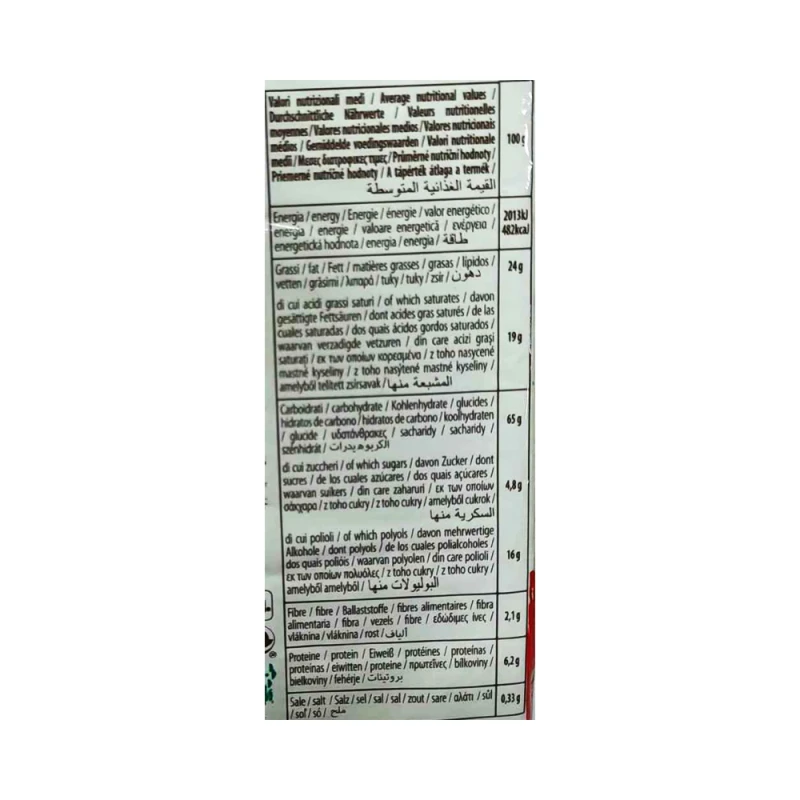 المكونات: دقيق قمح، زيت جوز الهند، نشا قمح، سكر، سكر العنب، بندق (7% في الكريمة)، مسحوق حليب منزوع الدسم، مسحوق مصل اللبن، كاكاو قليل الدسم¹، دقيق فول الصويا، مستحلبات: ليسيثين الصويا، ملح، مواد رافعة: بيكربونات الصوديوم.