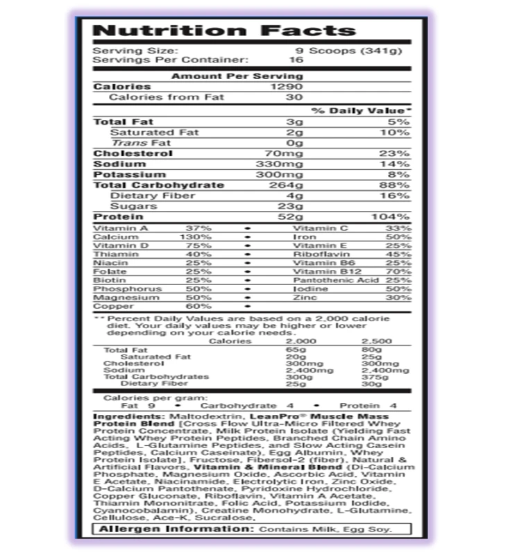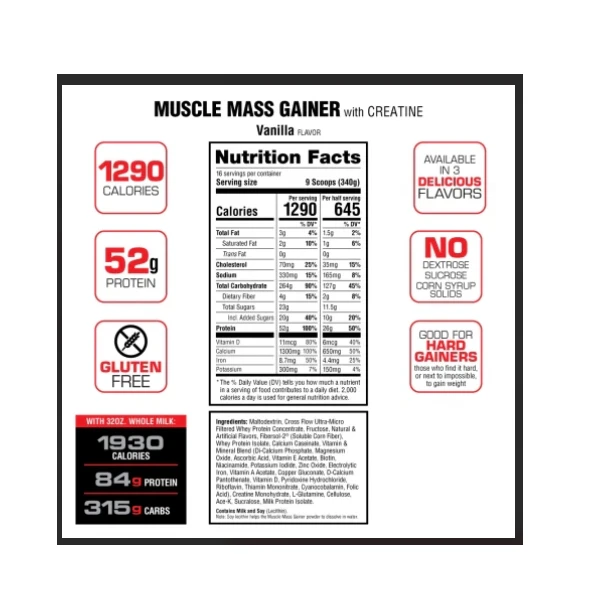 يقدم MUSCLE MASS GAINER مخفوقًا لذيذًا يحتوي على 1930 سعرة حرارية عالية التركيز و84 جرامًا من البروتين عند مزجه مع 32 أونصة من الحليب كامل الدسم.
