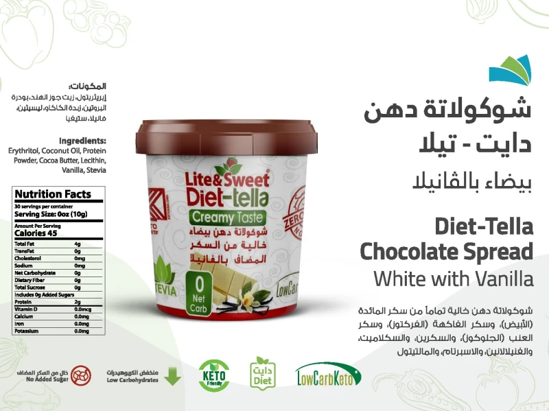 المكونات: محلي لايت آند سويت ( إريثريتول ، سكرلوز ) إنولين ، زيت نباتي ، بودرة الحليب ، بروتين الحليب، بودرة الكاكاو ، ليسيثين الصويا ، فانيلا .