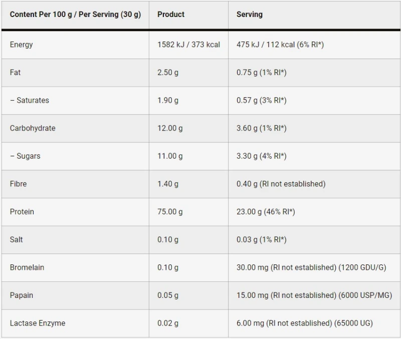 يحتوي مسحوقنا على 75% من البروتين لكل وجبة، ويوفر اللبنات الأساسية اللازمة لمساعدتك على تحقيق أهداف بناء العضلات. تشتمل تركيبتنا على إنزيمات هضمية مثل البروميلين والبابين واللاكتاز لدعم الهضم الأمثل وامتصاص العناصر الغذائية.
