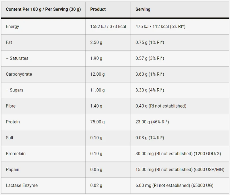 يحتوي مسحوقنا على 75% من البروتين لكل وجبة، ويوفر اللبنات الأساسية اللازمة لمساعدتك على تحقيق أهداف بناء العضلات. تشتمل تركيبتنا على إنزيمات هضمية مثل البروميلين والبابين واللاكتاز لدعم الهضم الأمثل وامتصاص العناصر الغذائية.