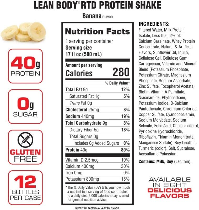 المياه المفلترة ، Lean Pro ؛ (مزيج خاص من عزل بروتين الحليب فائق التصفية بالرش المجفف ، ببتيدات بروتين مصل اللبن سريعة المفعول ، أحماض أمينية متفرعة السلسلة ، ببتيدات L-Glutamine ، وببتيدات الكازين البطيئة المفعول ، مركز بروتين مصل اللبن ، كازينات الكالسيوم) ، زيت القرطم عالي الزيت ، الألياف ؛ (Fructooligosaccharides ، جل السليلوز ، صمغ السليلوز ، Carageenan ، صمغ Xanthan) ، مزيج الفيتامينات والمعادن (فوسفات البوتاسيوم ، سترات البوتاسيوم ، فوسفات المغنيسيوم ، أسكوربات الصوديوم ، كبريتات الزنك ، توكوفيرول أسيتات ، البيوتين ، فيتامين أ بالميتات ، النياسيناداميد ، البوتاسيوم ، بانتوثينات د الكالسيوم ، كلوريد الكروم ، كبريتات النحاس ، سيانوكوبالامين ، موليبدات الصوديوم ، سيلينيت الصوديوم ، حمض الفوليك ، كوليكالسيفيرول ، بيريدوكسين هيدروكلوريد ، ريبوفلافين ، ثيامين أحادي نترات ، فوسفات الحديد ، كبريتات المنغنيز) ، نكهات طبيعية ، صويا. ، أصفر 5 ، أصفر 6.