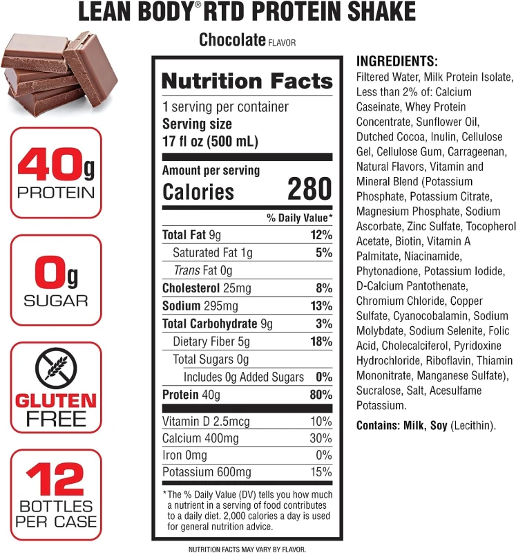 ماء مصفى ، عزل بروتين الحليب ، أقل من 2٪ من: كازينات الكالسيوم ، مركز بروتين مصل اللبن ، زيت عباد الشمس ، كاكاو هولندي ، إينولين ، جل السليلوز ، صمغ السليلوز ، كاراجينان ، نكهات طبيعية ، مزيج الفيتامينات والمعادن (فوسفات البوتاسيوم ، سترات البوتاسيوم ، فوسفات المغنيسيوم ، أسكوربات الصوديوم ، كبريتات الزنك ، توكوفيرول أسيتات ، البيوتين ، فيتامين أ بالميتات ، نياسيناميد ، فيتوناديون ، يوديد البوتاسيوم ، د- بانتوثينات الكالسيوم ، كلوريد الكروم ، كبريتات النحاس ، سيانوكوبالامين ، موليبدات الصوديوم ، كوليدينايت الصوديوم هيدروكلوريد ، ريبوفلافين ، ثيامين مونونيترات ، كبريتات المنغنيز) ، سكرالوز ، ملح ، أسيسولفام البوتاسيوم.
