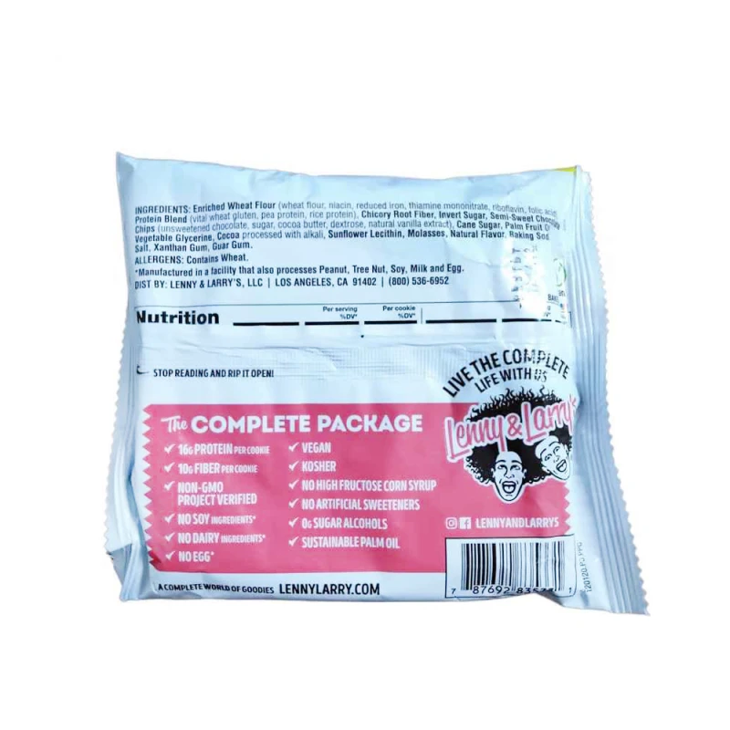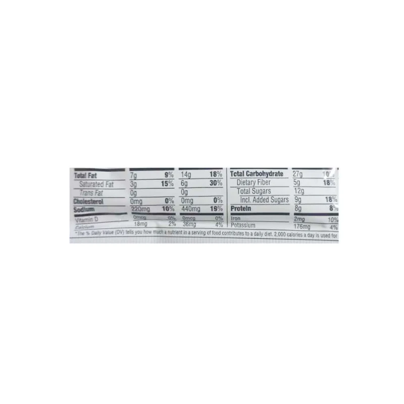 دقيق القمح المخصب (دقيق القمح ، النياسين ، الحديد المخفض ، أحادي نترات الثيامين ، الريبوفلافين ، حمض الفوليك) ، مزيج البروتين (جلوتين القمح الحيوي ، بروتين البازلاء ، بروتين الأرز) ، الإنولين ، السكر المحول ، رقائق الشوكولاتة شبه الحلوة (شوكولاتة غير محلاة ، سكر ، زبدة الكاكاو ، سكر العنب ، مستخلص الفانيليا الطبيعي) ، قصب السكر ، زيت ثمار النخيل ، الجلسرين النباتي ، الكاكاو المعالج بالقلويات ، ليسيثين دوار الشمس ، دبس السكر ، نكهة طبيعية ، صودا الخبز ، ملح ، صمغ الزانثان ، صمغ الغوار.