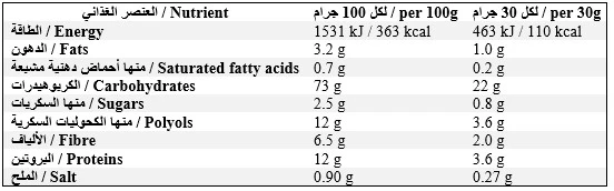 قمح كامل 26.8%، شوفان كامل 25.3%، أرز 25.3%، دقيق قمح طري كامل 12.7%، مُحلي مالتيتول، حليب خالي الدسم بودرة، جلوتين القمح، ملح، عامل تخمير كربونات الصوديوم، مستحلب ليسيثين عباد الشمس. قد يحتوي على فول الصويا، خردل، بندق، لوز، جوز كاجو، جوز البقان، الجوز، الشعير، والجاودار.