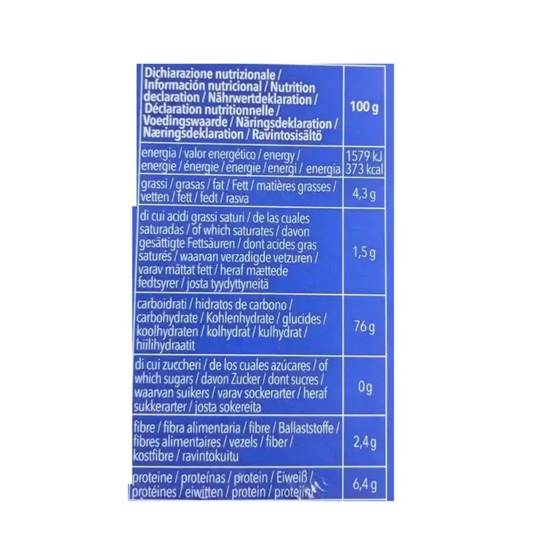 نشا الذرة، بيض* 23%، دقيق الأرز، دقيق الذرة، مستحلب: أحادي وثنائي الغليسريدات للأحماض الدهنية؛ مادة مُكثِّفة: صمغ الغوار.قد يحتوي على آثار من الصويا.خالٍ من اللاكتوز.خالٍ من القمح.