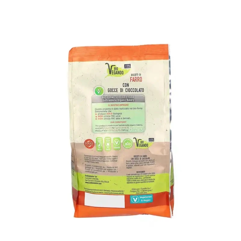 بسكويت عضوي مفتت، مع دقيق الحنطة، لا يقاوم بقطرات الشوكولاتة. مصنوع بدون الحليب والبيض، ولكنه بالتأكيد ليس فقيرًا بالعناصر الغذائية. فهي في الواقع مصدر للألياف والكالسيوم. مناسب أيضًا لأولئك الذين يتبعون نظامًا غذائيًا نباتيًا.