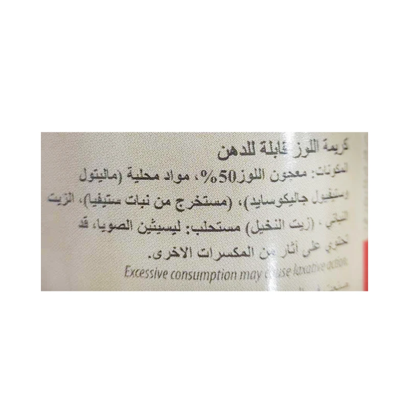 المحليات: جليكوسيدات مالتيتول وستيفيول (مستخلص من نبات ستيفيا) ، زيوت نباتية (زيت عباد الشمس و / أو زيت بذرة القطن بنسب متفاوتة) ، بندق محمص مبشور 20٪ ، مسحوق كاكاو منزوع الدسم 8٪ ، معجون بندق 5٪ ، مسحوق مصل اللبن مسحوق حليب كامل الدسم مستحلب: ليسيثين الصويا والمنكهات. قد تحتوي على آثار من اللوز والفول السوداني وبذور السمسم. الاستهلاك المفرط قد يسبب عمل ملين.