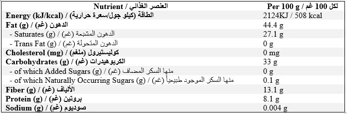 يحتوي على الصويا. قد يحتوي على الحليب والبندق وجوز البيكان والفستق الحلبي والفول السوداني والمكسرات الأخرى.