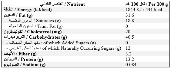 يحتوي على الصويا والحليب. قد يحتوي على البندق واللوز وجوز البيكان والفستق الحلبي والفول السوداني والمكسرات الأخرى
