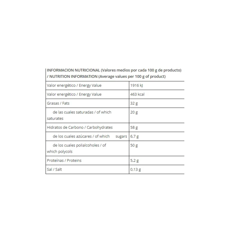 المحليات (المالتيتول)، زبدة الكاكاو، مسحوق الحليب كامل الدسم، معجون الكاكاو، الزبدة، مستحلب (ليسيثين الصويا) والمنكهات. الكاكاو: 30% كحد أدنى. يحتوي على سكريات طبيعية. الاستهلاك المفرط قد يؤدي إلى آثار ملين. خالي من الغلوتين.