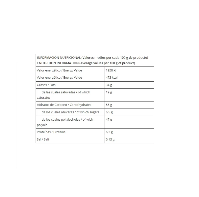 محليات (مالتيتول)، زبدة كاكاو، مسحوق حليب كامل الدسم، معجون كاكاو، لوز (6%)، زبدة، مستحلب (ليسيثين الصويا) ونكهات. الكاكاو: 30% كحد أدنى. يحتوي على سكريات طبيعية. الاستهلاك المفرط قد يؤدي إلى آثار ملين. خالي من الغلوتين.