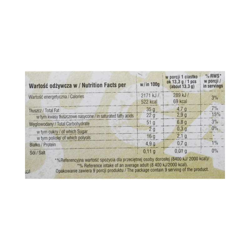 دقيق قمح، دهون نباتية (ثمار النخيل)، مادة محلية: مالتيتول، جوز هند مجفف 9.5%، كتلة بيض مبستر، مواد منكهة، عوامل تخمير: كربونات صوديوم، كربونات أمونيوم؛ ملح، لون: كاروتينات.