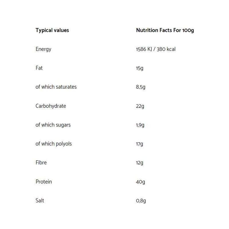 عبارة عن لوح بروتين يحتوي على نسبة 45٪ من البروتين المذهل ومحتوى عالٍ من الألياف الغذائية. خالي من الغلوتين واللاكتوز والسكر والسبارتام والمواد المعدلة وراثيًا.