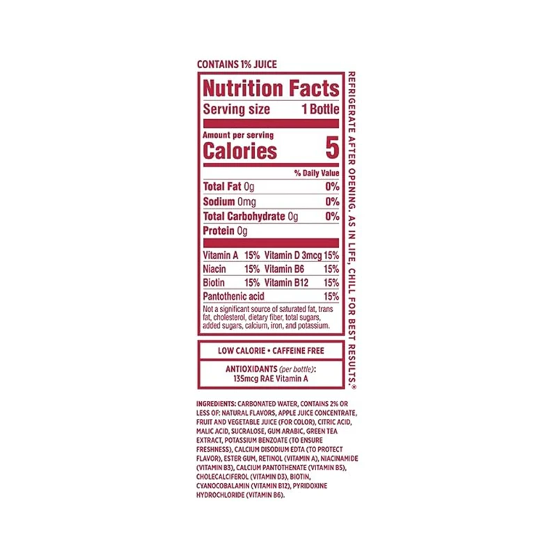 ماء مكربن ، نكهات طبيعية ، عصير فواكه وخضروات (للون) ، حمض الستريك ، حمض ماليك ، مركز عصير التفاح ، بنزوات البوتاسيوم (لضمان النضارة) ، سكرالوز ، صمغ عربي ، قشدة. نكهة) ، علكة استر ، ريتينول (فيتامين أ) ، نياسيناميد (فيتامين ب 3) ، بانتوثينات الكالسيوم (فيتامين ب 5) ، كوليكالسيفرول (فيتامين د 3) ، بيوتين ، سيانوكوبالامين (فيتامين بي 12).