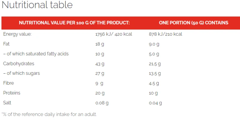 شوكولاتة 25% (كتلة الكاكاو، سكر، زبدة الكاكاو، مستحلبات: ليسيثين (صويا)، E492؛ نكهة الفانيليا الطبيعية)، مركز بروتين مصل اللبن WPC 80 (حليب) 24,3%، شراب الجلوكوز، إنولين، عامل شد: مالتيتول؛ دهن النخيل غير المهدرج، مرطب: السوربيتول؛ مواد غنية: سترات المغنيسيوم، فيتامين ج، النياسين، فيتامين ه، حمض البانتوثنيك (ب5)، فيتامين ب6، الثيامين (ب1)، فيتامين ب12؛ المنكهة، مستحلب: الليسيثين (فول الصويا).