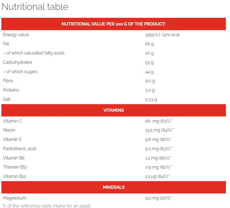 رقائق جوز الهند 28% (تحتوي على: ثاني أكسيد الكبريت)، شوكولاتة الحليب 20% (سكر، زبدة الكاكاو، مسحوق الحليب كامل الدسم، كتلة الكاكاو، دهن الحليب اللامائي، مستحلب: الليسيثين (فول الصويا)؛ نكهة الفانيليا الطبيعية)، سكر، شراب الجلوكوز، قابل للذوبان ألياف الذرة، اللاكتوز (الحليب)، مرطب: الجلسرين؛ مسحوق مصل اللبن (الحليب)، مواد غنية: ل-كارنيتين 0,31%، سترات المغنيسيوم، فيتامين ج، النياسين، فيتامين ه، حمض البانتوثنيك (ب5)، فيتامين ب6، الثيامين (ب1)، فيتامين ب12؛ ملح البحر، نكهة، مستحلب: الليسيثين (فول الصويا).