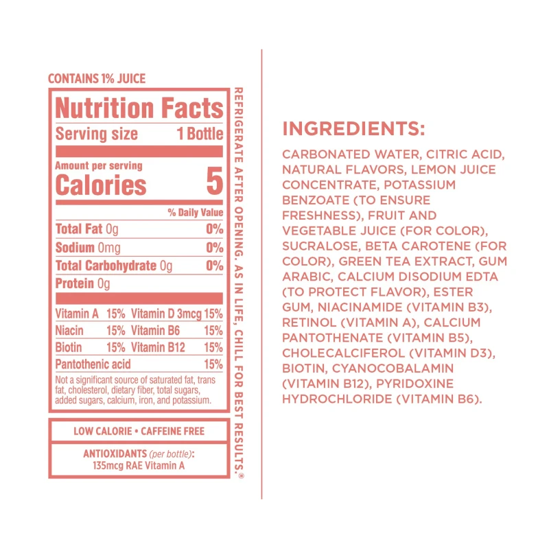 ماء مكربن ، حمض الستريك ، نكهات طبيعية ، مركز عصير الليمون ، بنزوات البوتاسيوم (لضمان نضارة) ، عصير الفواكه والخضروات (للون) ، سكرالوز ، بيتا كاروتين (للون) ، قشدة. EDTA (لحماية النكهة) ، علكة استر ، نياكيناميد (فيتامين ب 3) ، ريتينول (فيتامين أ) ، بانتوثينات الكالسيوم (فيتامين ب 5) ، كوليكالسيفيرول (فيتامين د 3) ، بيوتين ، سيانوكوبالامين (فيتامين بي). 6)
